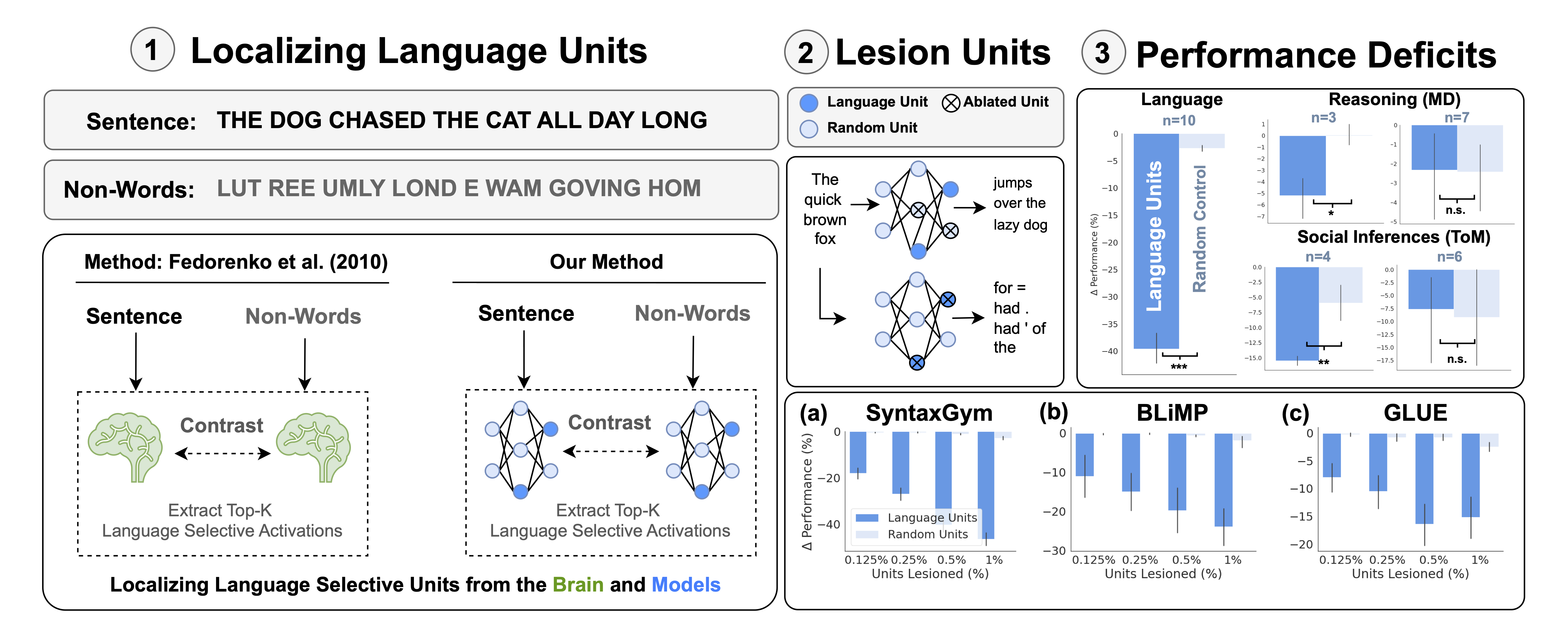 Finding I: Ablating 1% of LLM "language network" units disrups next-word prediction performance (and performance on various other linguistic benchmarks).